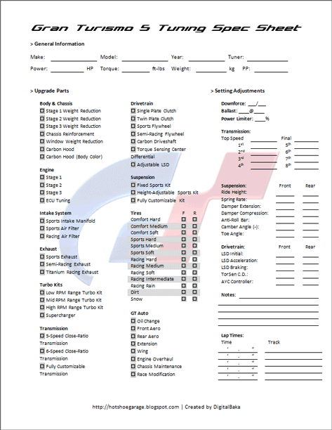 I created two versions, one for new versions of MS Word and one for older versions. The older version simply lacks the unit drop down boxes. If you don't use HP and ft-lbs you will have to manually change those. I know that I probably have not covered all the different units used in GT5 and I will release an updated version once I am able to list out all the different options. I don't know how well this would work in a non-Word document editor but I imagine the compatibility version would be your best bet in that case. If there is someone out there who can pop this into an editable PDF format I would appreciate that just to have another, more universal format for folks.